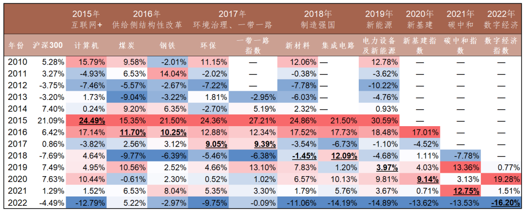 两会后行情有望向重点产业政策对应的主题板块偏移。以史为鉴,2015年“互联网+”主题、2016年供给侧结构性改革亮相政府工作报告、2017年环境治理和一带一路成为两会期间热词、2018年两会强调“加快制造强国建设”、2020年“新基建”以及2021年“碳达峰、碳中和”首次被写进两会政府工作报告,分别带动对应主题板块在当年两会后一个月表现不俗,相较沪深300超额收益显著。