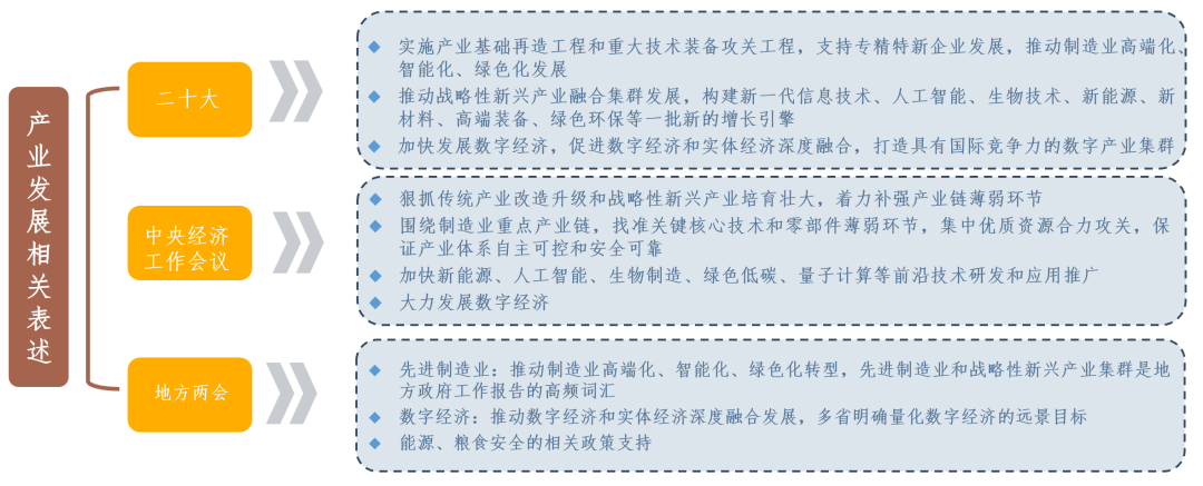 ➤ 1)二十大报告指出建设现代化产业体系是高质量发展的着力点,强调“推动制造业高端化、智能化、绿色化发展”、“构建新一代信息技术、人工智能、生物技术、新能源、新材料、高端装备、绿色环保等一批新的增长引擎”、“加快发展数字经济,促进数字经济和实体经济深度融合”。